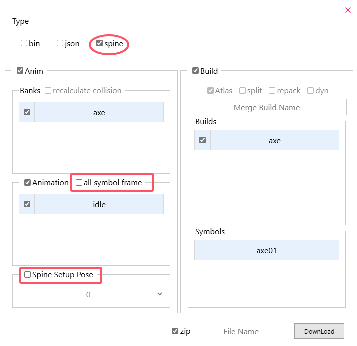 exportbutton and select type asbin,Check therepackbutton。 - Check other buttons if you need. For button functions, please refer to Animation Tool Export。