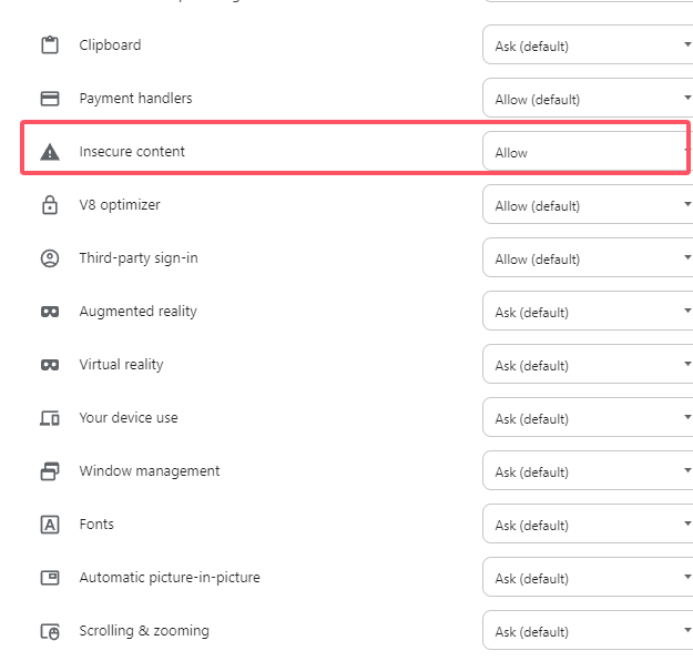 3. In the pop-up page, scroll to the bottom and set the `Insecure content` content to Allowed.
